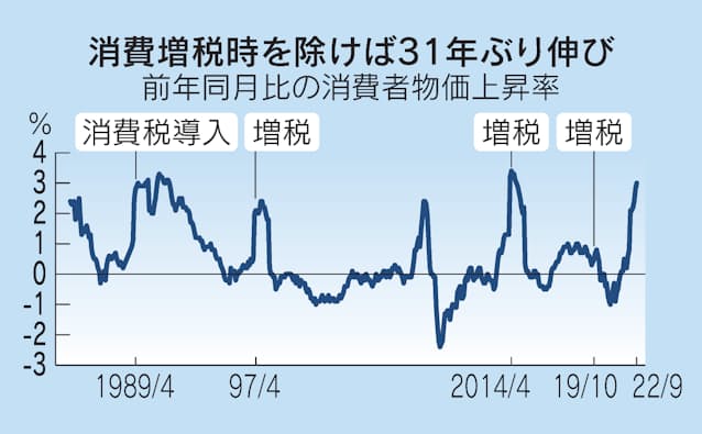 日銀は27~28日の金融政策決定会合で大規模緩和の現状維持を決めました。9月の消費者物価指数(CPI、生鮮食品除く)は前年同月比で3.0%の上昇率となり、日銀が目標とする2%を大きく上回りました。悲願の2%を達成したのに日銀が動かないのは「物価上昇は一時的」とみているからです。
